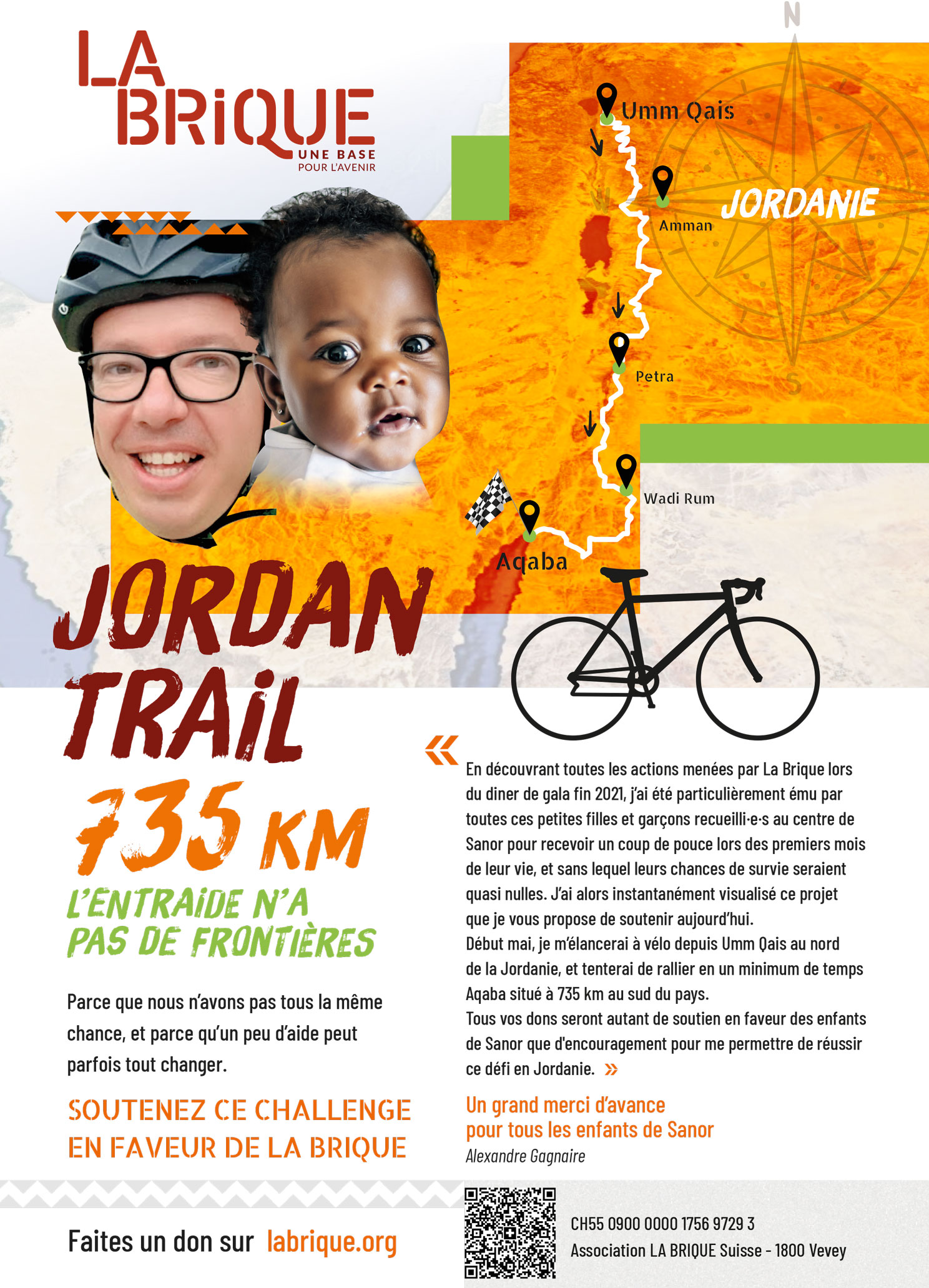«Lors du diner de gala de 2021, en découvrant toutes les actions menées par La Brique, j’ai été particulièrement ému par ces petites filles et garçons confiés au centre d’accueil Sanor suite aux décès de leurs mères en couche, à un abandon, ou à l’impossibilité pour leurs parents d’assurer leurs soins, raconte Alexandre. Ils y reçoivent un coup de pouce salutaire lors des premiers mois de leur vie. Sans cela, leurs chances de survie seraient quasi nulles. J’ai alors instantanément visualisé le projet du Jordan Trail pour lever des fonds et soutenir ces enfants.»