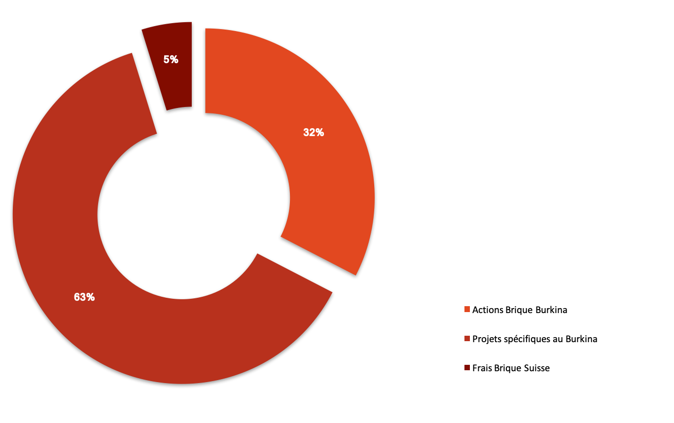 Entre 92% et 98% des dons, en fonction des années, sont destinés à la mise en oeuvre des projets de La Brique Burkina. En moyenne, ce sont donc 5% seulement du budget qui sont alloués aux frais de La Brique Suisse (frais de communication et d’organisation d’événements de soutien), dont plus de la moitié est pris en charge par l’un de nos partenaires que nous remercions infiniment.